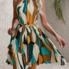 Tämä on naisten loma-asu rantaan, jossa on geoprinttikuvioinen mekko. Siinä on vyö ja halteripääntie, jotka sopivat täydellisesti tyylikkääseen ja mukavaan lookiin meren rannalla.